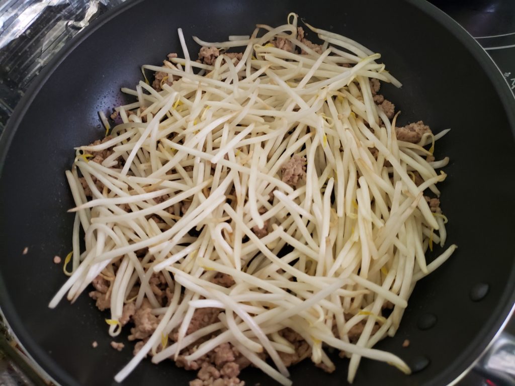 もやしとひき肉とフライパンがあれば作れる「もやしのにんにく醤油炒め」です。