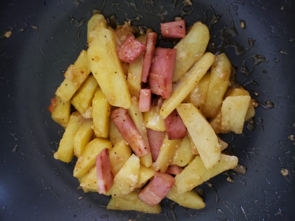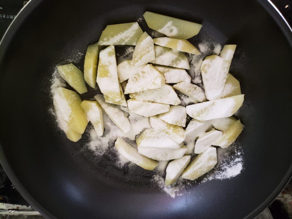 ②フライパンに油を熱し、じゃがいもを中火で約3分、両面がこんがりするまで炒める。